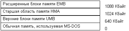 · верхние блоки памяти (Upper Memory Blocks или UMB) - располагаются между границей 640 Кбайт и 1 Мбайт. Расположение и размер этих блоков могут сильно изменяться в зависимости от конфигурации аппаратуры компьютера;