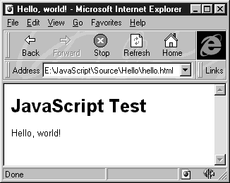<HTML> <HEAD> <TITLE>Hello, world!</TITLE> </HEAD> <BODY BGCOLOR=white> <H1>JavaScript Test</H1> Hello, world! </BODY> </HTML>
