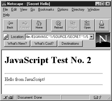 В результате работы нашей второй программы в окне браузера Netscape Navigator появится строка "Hello from JavaScript!", выделенная сверху и снизу горизонтальными линиями (рис. 1.2).