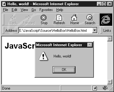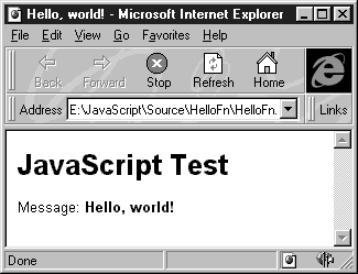 Помимо переменной szHelloMsg, в области заголовка документа HTML мы определили с помощью ключевого слова function две функции с именами printString и printHello. Первая из этих функций выводит в документ HTML строку, передаваемую ей в качестве параметра, а вторая выводит сообщение “Hello, world!”, вызывая для этого первую функцию.
