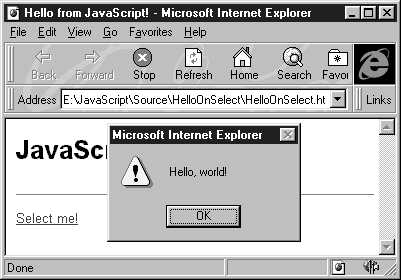 Ссылка оформлена с применением операторов <SCRIPT> и </SCRIPT>, однако между этими операторами нет ни одной строчки исходного текста. Мы перенесли этот текст в файл hello.js (листинг 1.3).