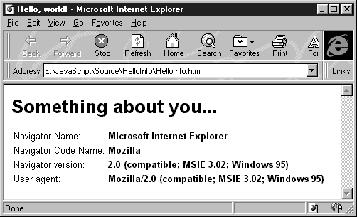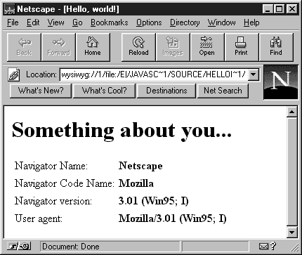 Подробнее об этом мы расскажем позже, а сейчас отметим только, что метод write нашей программы записывает в тело документа HTML приветственную строку "Hello, world!". При этом документ будет выглядеть так, как будто эта строка находится в нем на месте сценария:
