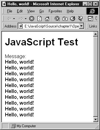 Рис. 1.9. Сценарий отображает в документе HTML десять одинаковых строк