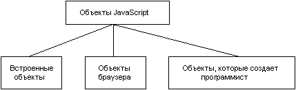 В языке JavaScript имеется три типа объектов: встроенные объекты, объекты браузера и объекты, которые программист создает самостоятельно (рис. 2.1).