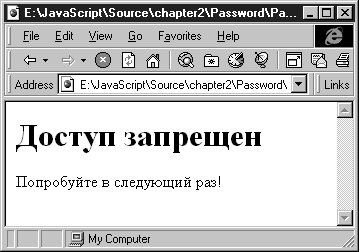 Сложный на первый взгляд эффект достигается чрезвычайно просто: изменением свойства bgColor объекта document. В листинге 2.10 мы привели пример сценария, который после загрузки документа HTML в окно браузера изменяет цвет его фона с белого на черный.